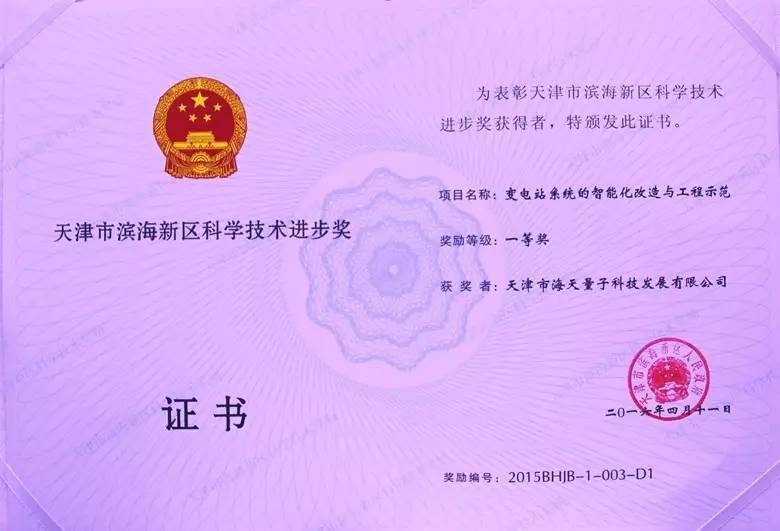 2015年度,天津市共有199項科技成果獲獎,其中由我集團下屬全資子公司“天津市海天量子科技發(fā)展有限公司”申報的《變電站系統(tǒng)的智能化改造與工程示范》項目喜獲天津市科學技術進步二等獎,濱海新區(qū)科學技術進步一等獎。