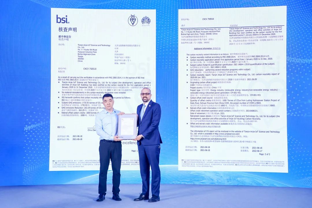 會上,BSI(英國標(biāo)準(zhǔn)協(xié)會)戰(zhàn)略伙伴關(guān)系總監(jiān) Paulo Lopes為安捷物聯(lián)頒發(fā)2020年度碳中和認(rèn)證證書,安捷物聯(lián)正式成為天津市第一家獲BSI碳中和認(rèn)證的企業(yè)。